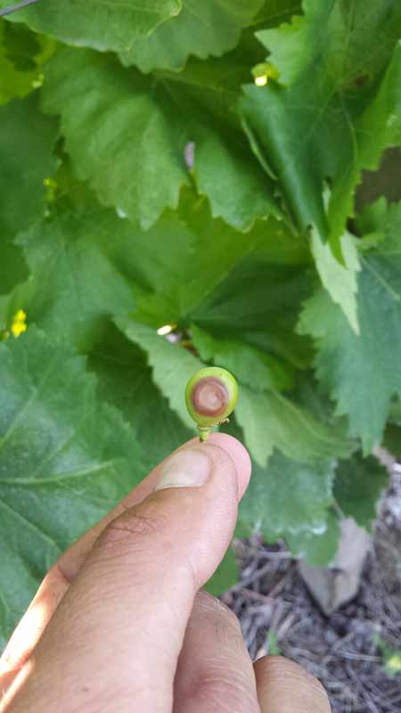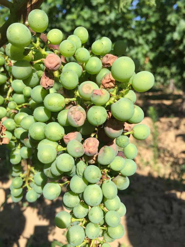 Готово у исто време, у виноградима су се појавили и симптоми црне трулежи. Бобице добијају браон боју, дехидрирају и потпуно се суше. Ове сасушене бобице и делови гроздова остају на биљци до бербе и одатле даље врше инфекције. Понекад је јако тешко разликовати ове две врсте симптома, али није немогуће.