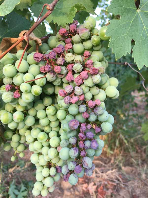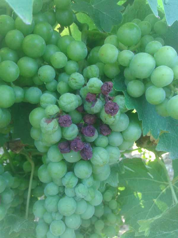 Последњих дана на бобицама гроздова који су изложени сунцу могу се уочити тамне зоне и сушење делова бобица или чак целих бобица. Уколико се не ради о црној трулежи, у питању су ожеготине. Иако су у овој фази симптоми веома слични, овде ћемо дати сугестије како се ипак могу разликовати. Када су у питању ожеготине оне се увек јављају на осунчаним деловима гроздова и то најчешће са западне стране, односно на оним гроздовима који су сунцу изложени у послеподневним часовима (после 12 сати), када је и сунчево зрачење највеће. Сунчани период са високим температурама је наступио нагло, тако да покожица бобице није имала довољно времена за прилагођавање. У случајевима где је дефолијација у зони грожђа обављена одмах након цветања, ожеготина готово да нема, јер је бобица још одмах после цветања и формирања била изложена сунцу и успела је да се прилагоди.